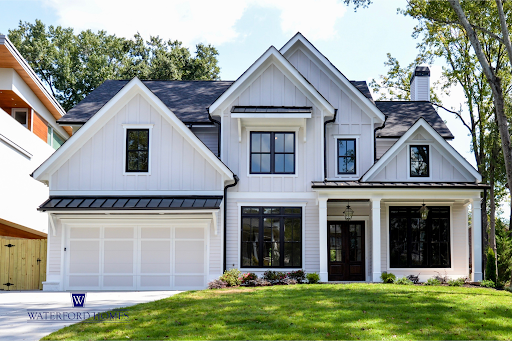 We also are looking for something more warm and inviting than the stark all white. Popular in modern farmhouse and industrial home designs black windows create a dramatic focal point in your home. White house exterior with board and batten and black windows and doors via The Fat Hydrangea and 3 Pillars Homes.